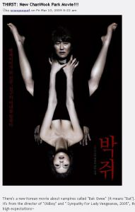 The new film is greatly awaited by fans of the director. This poster has Song Kang-ho wearing a priest's costume and Kim Ok-vin is hanging onto him upside down as if she were a bat!