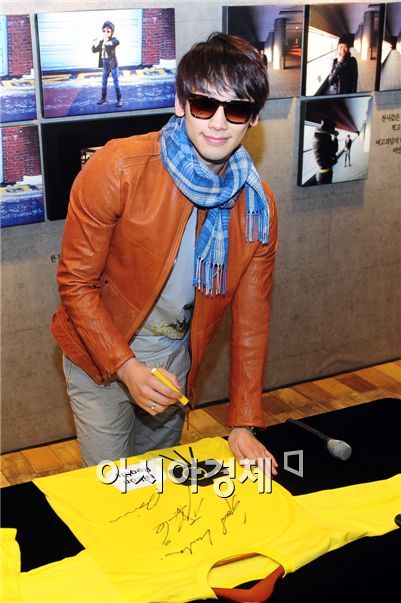 Singer and actor Rain signs a t-shirt at his photo exhibition held at coffee shop Byul in Seoul, South Korea on March 14, 2010.
