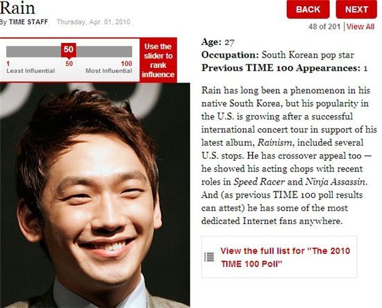 Asian singer Rain a candidate for TIME's most influential people [TIME Magazine official webpage]
